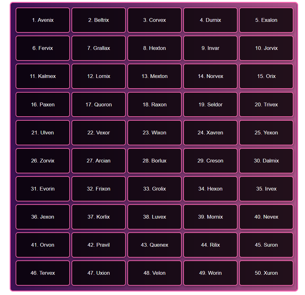 Below is a uniquely arranged table featuring 50 cool names for Blooket. These names are presented without meanings to offer a quick, organized selection for those who prefer a visual layout.